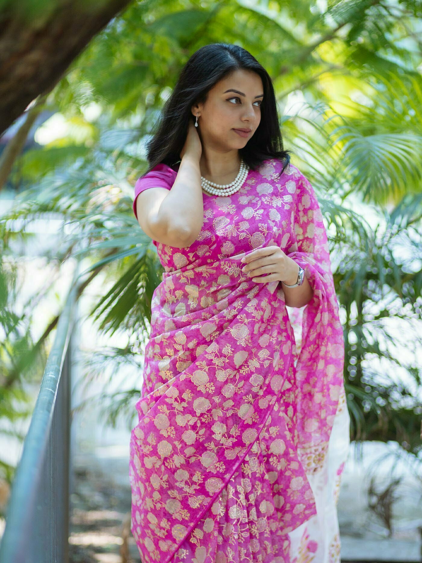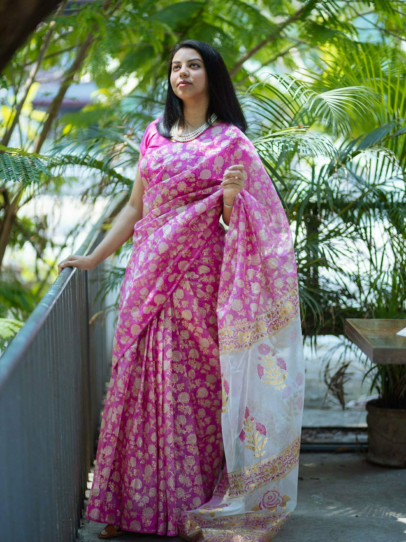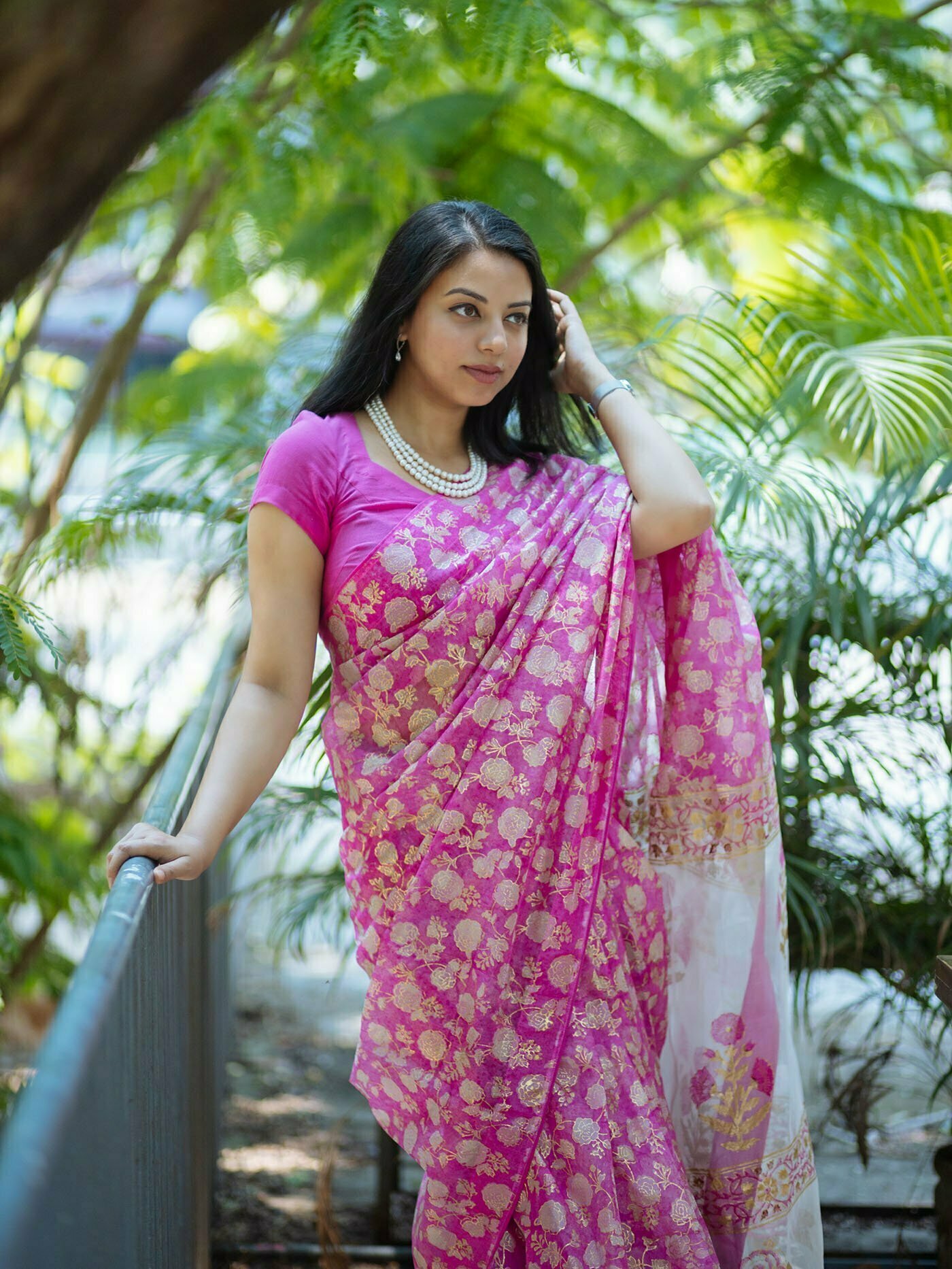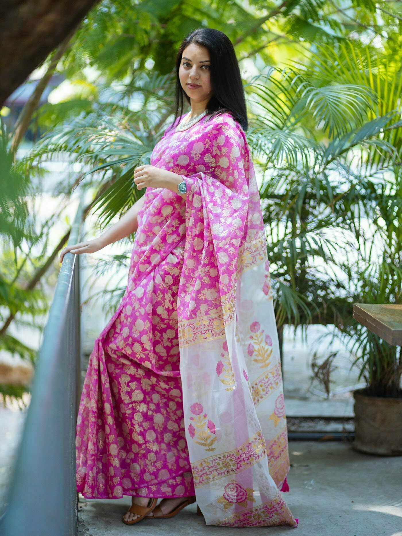 Moslin handbook printed dye s saree comes with handblock printed separate blouse piece.