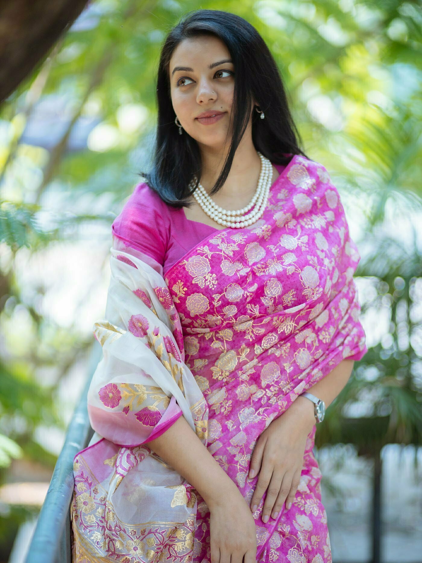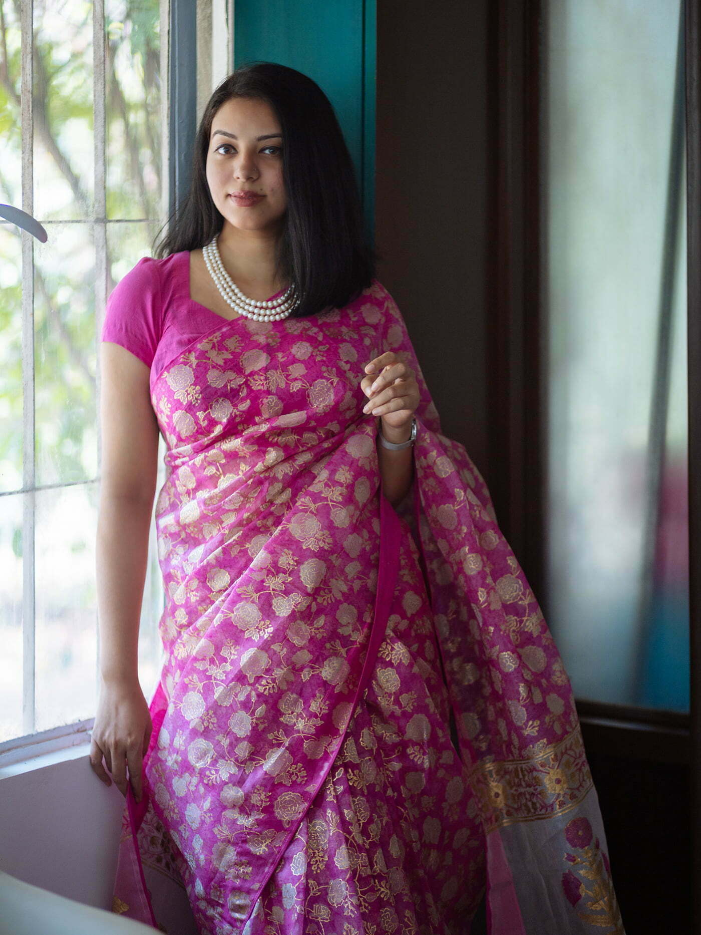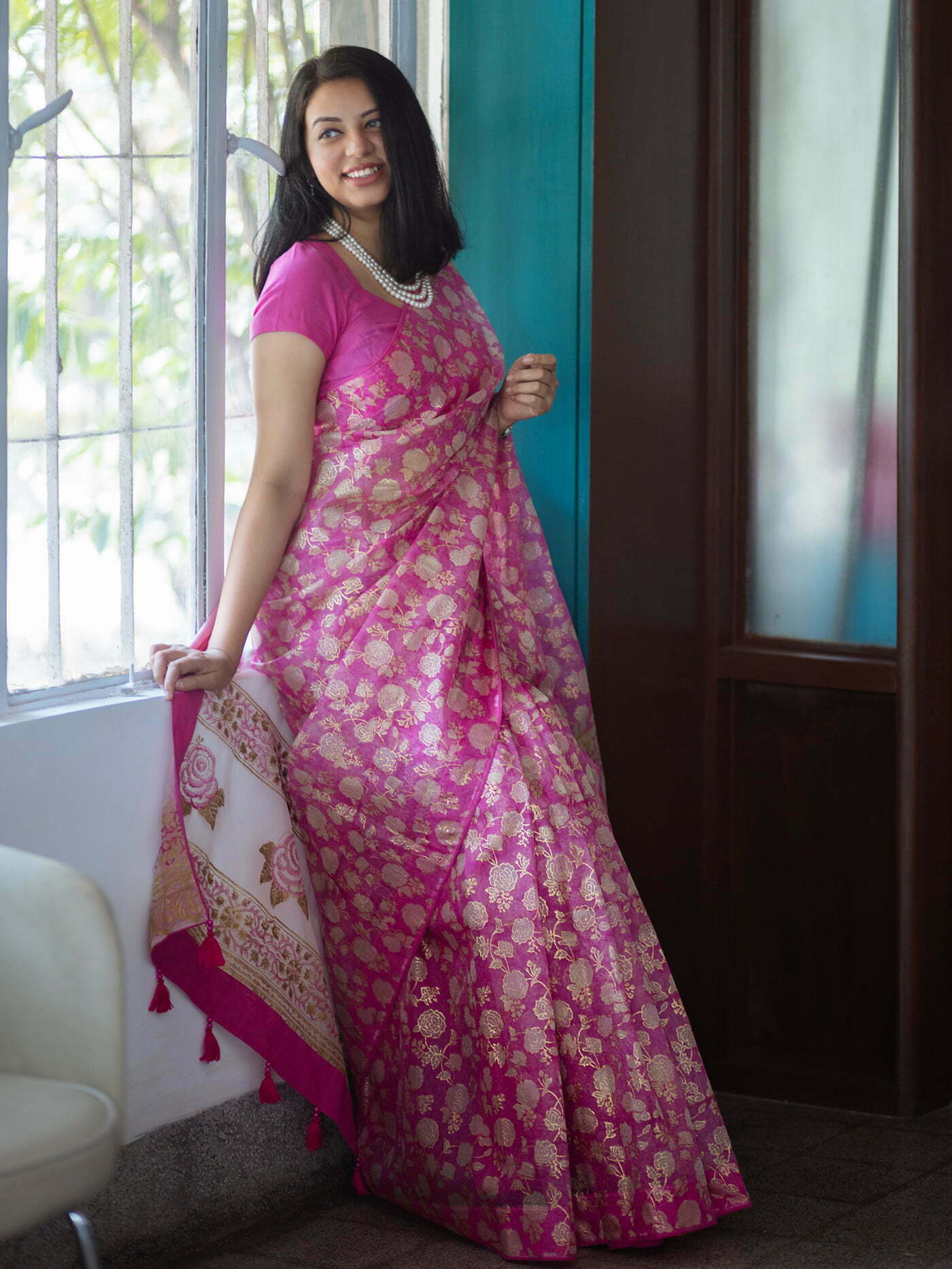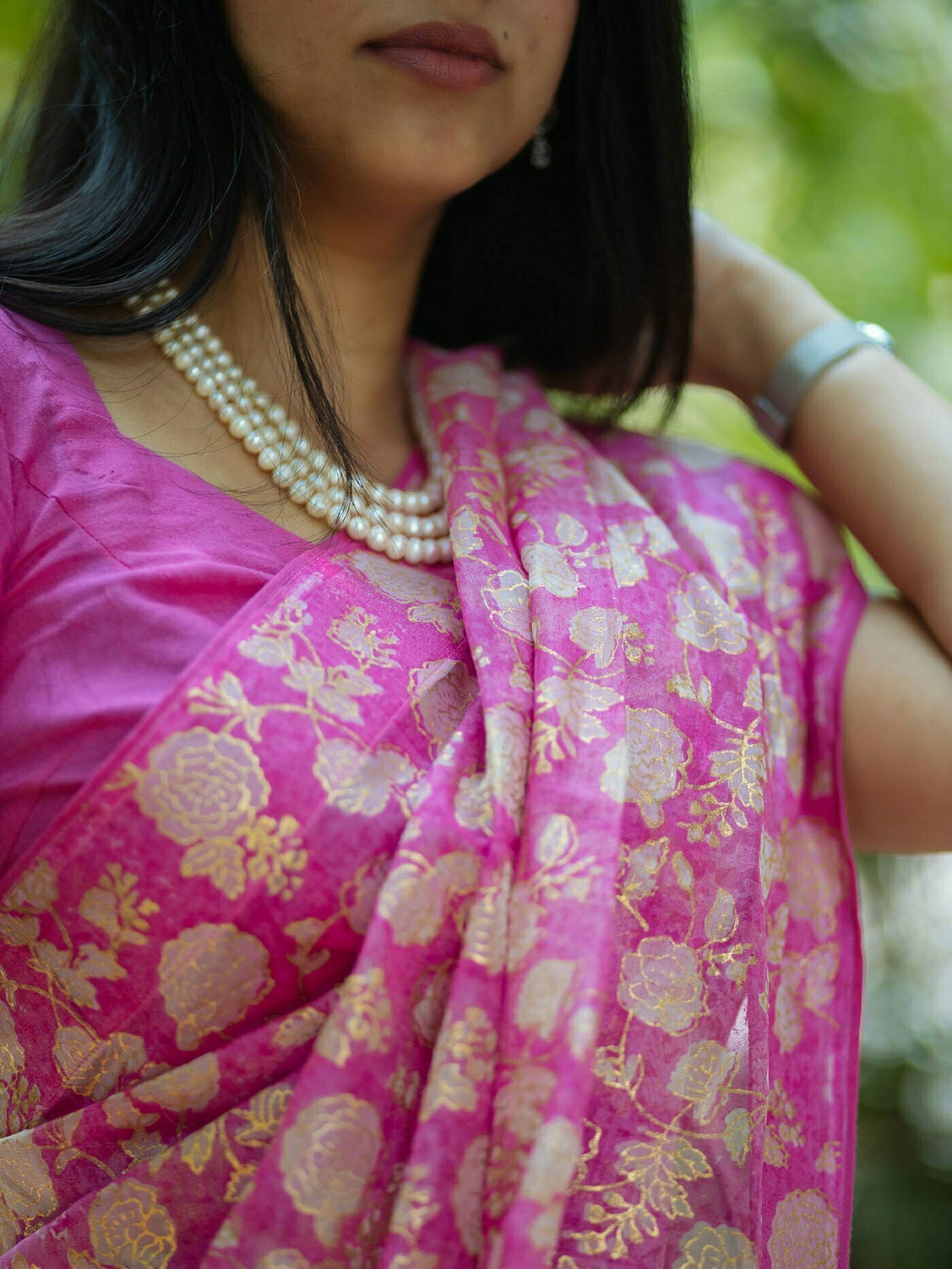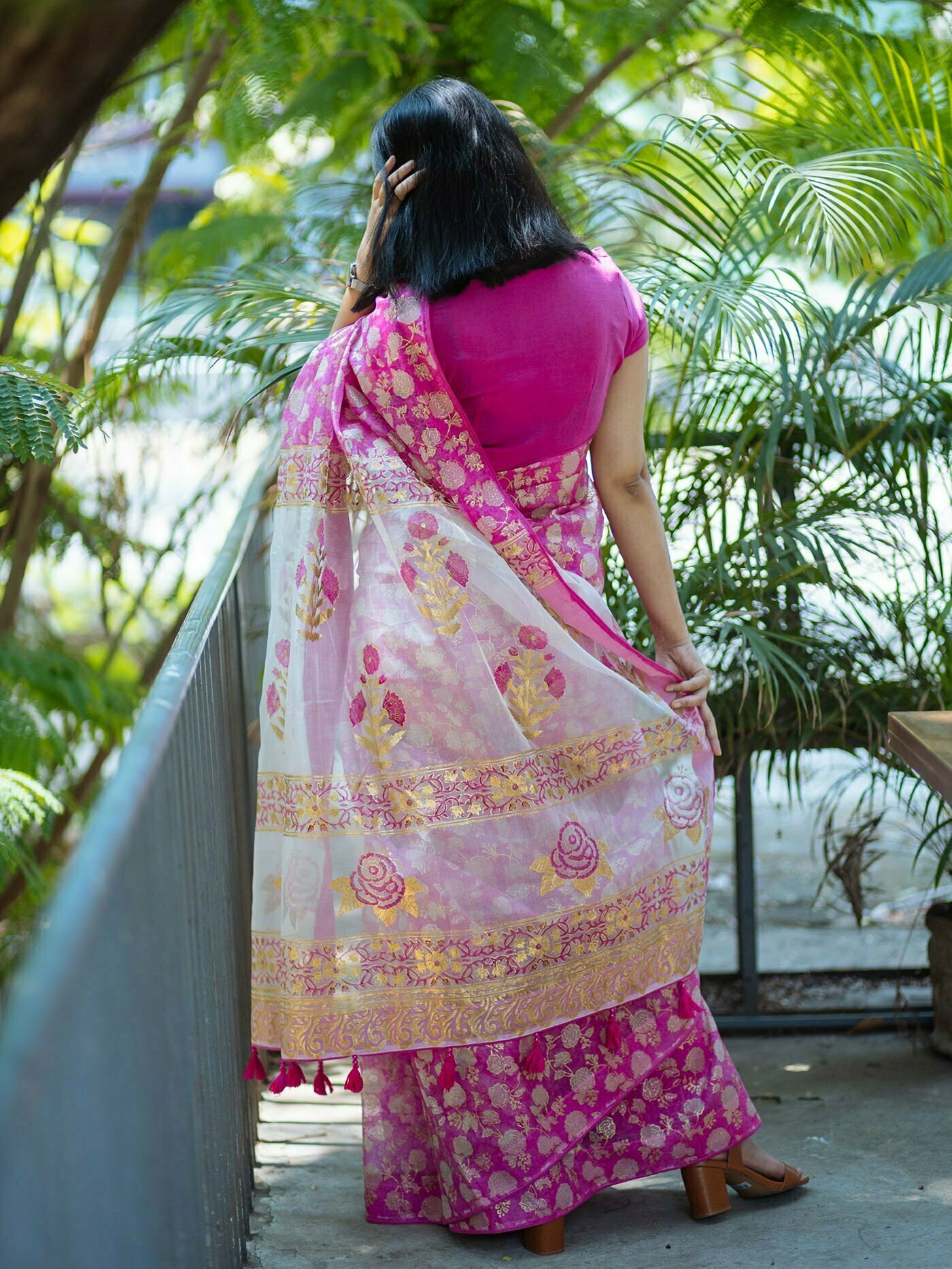 Moslin handbook printed dye s saree comes with handblock printed separate blouse piece.