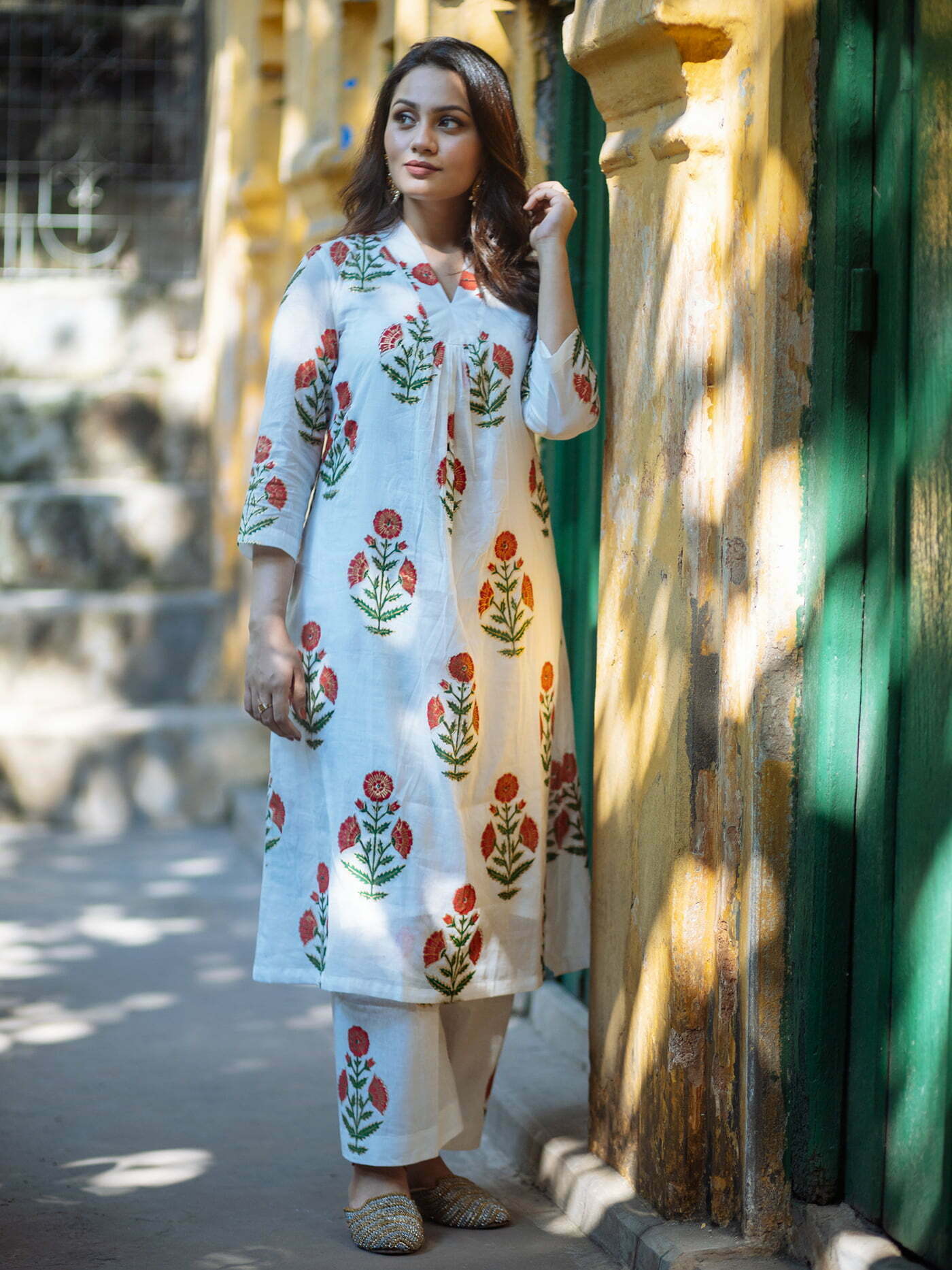 Featuring- straight cut agroduth Voile cotton block printed Kameez, pants and  dupatta.