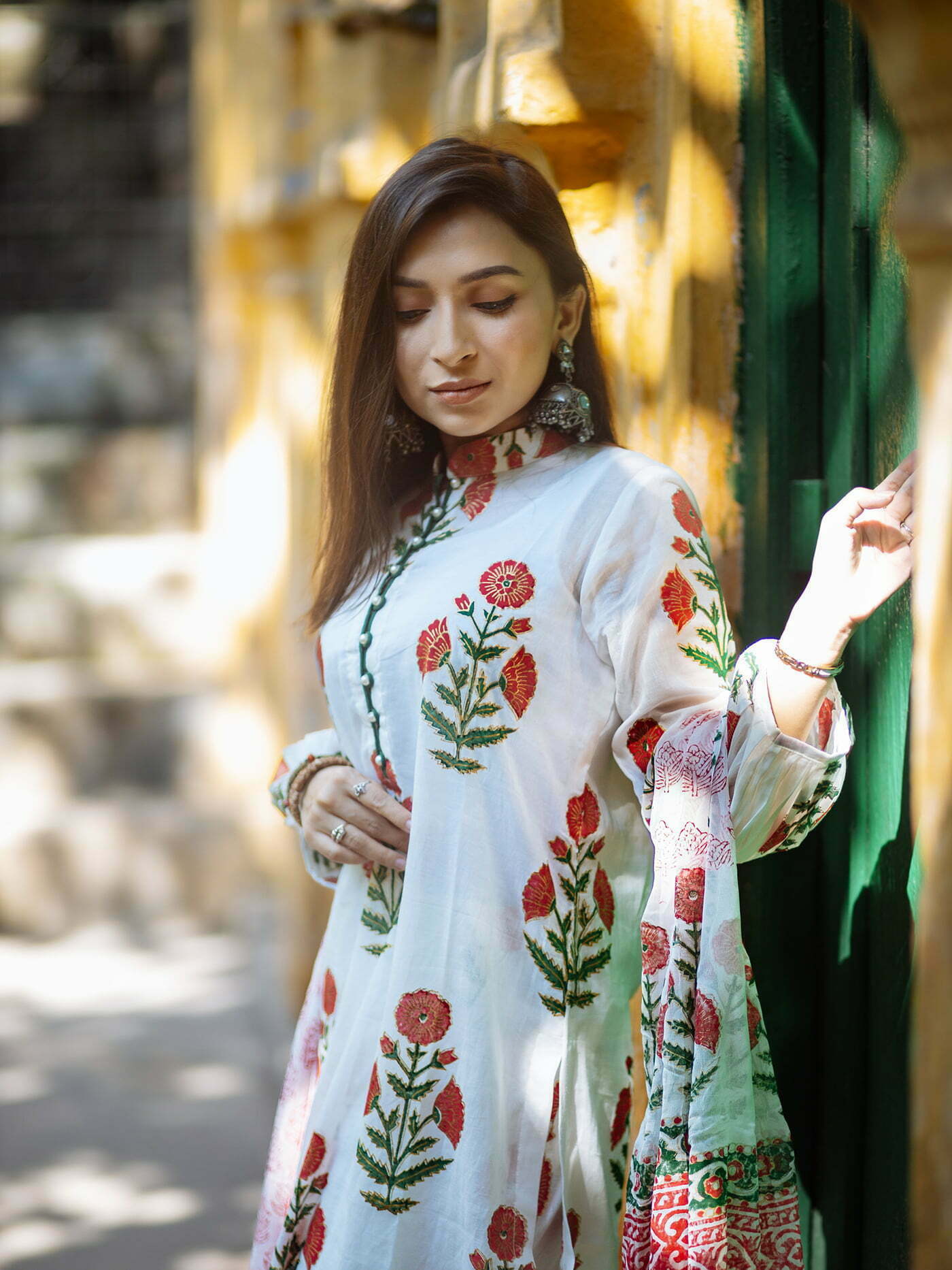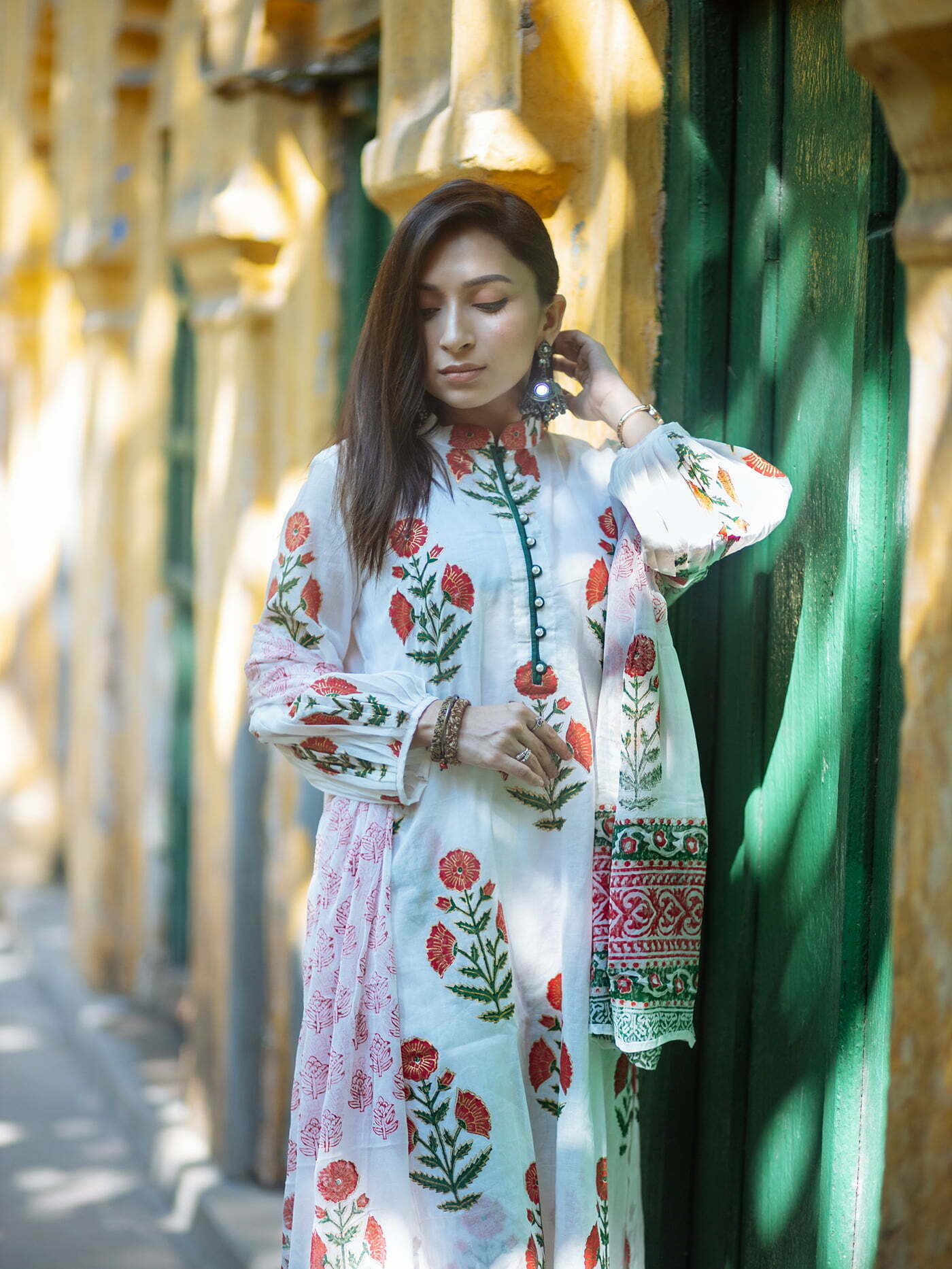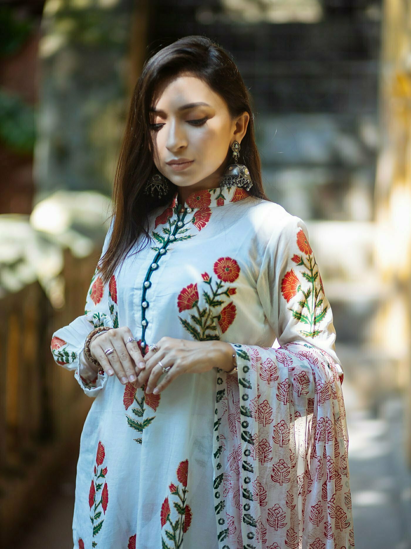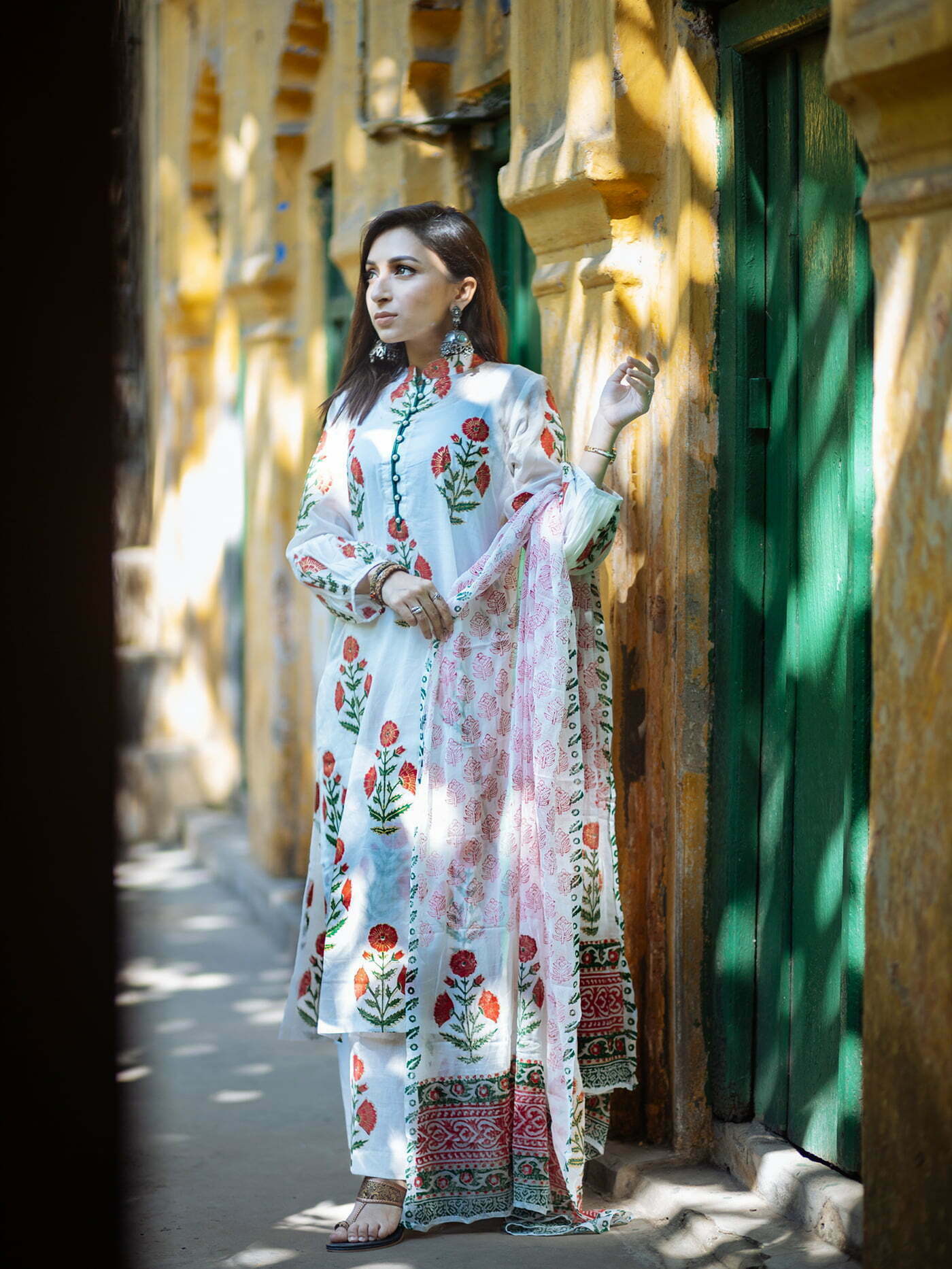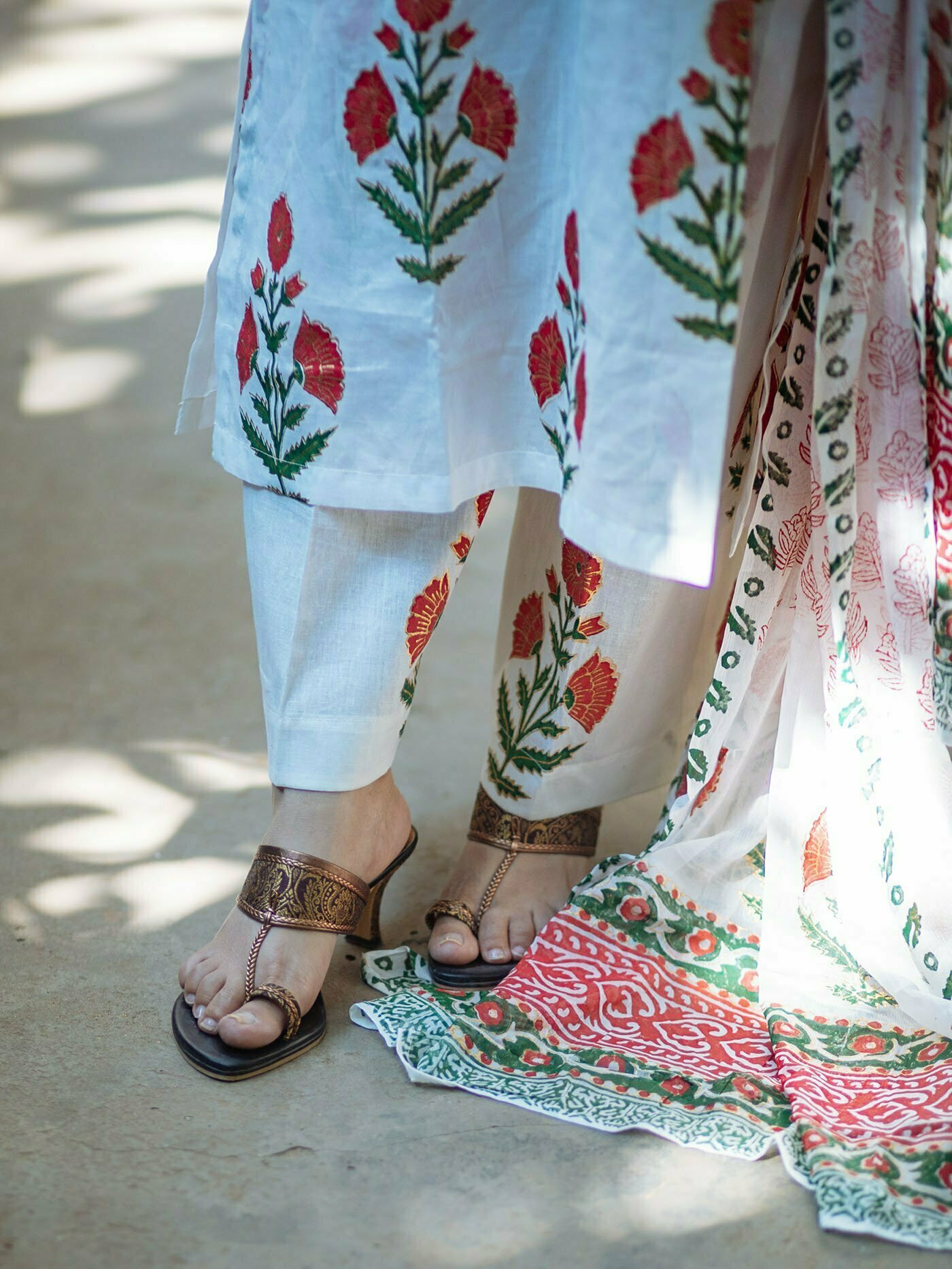 Featuring- straight cut agroduth Voile cotton block printed Kameez, pants and  dupatta.