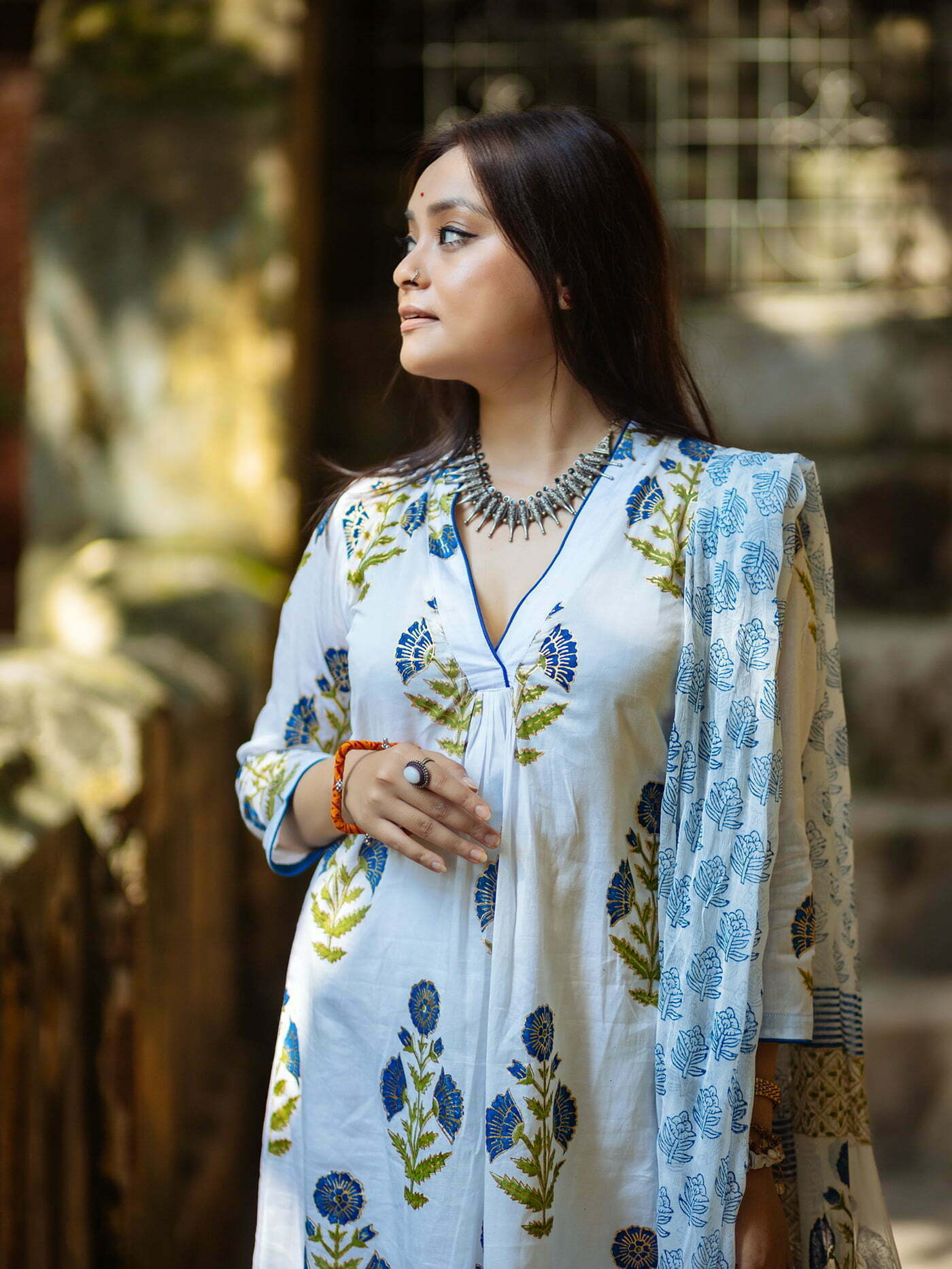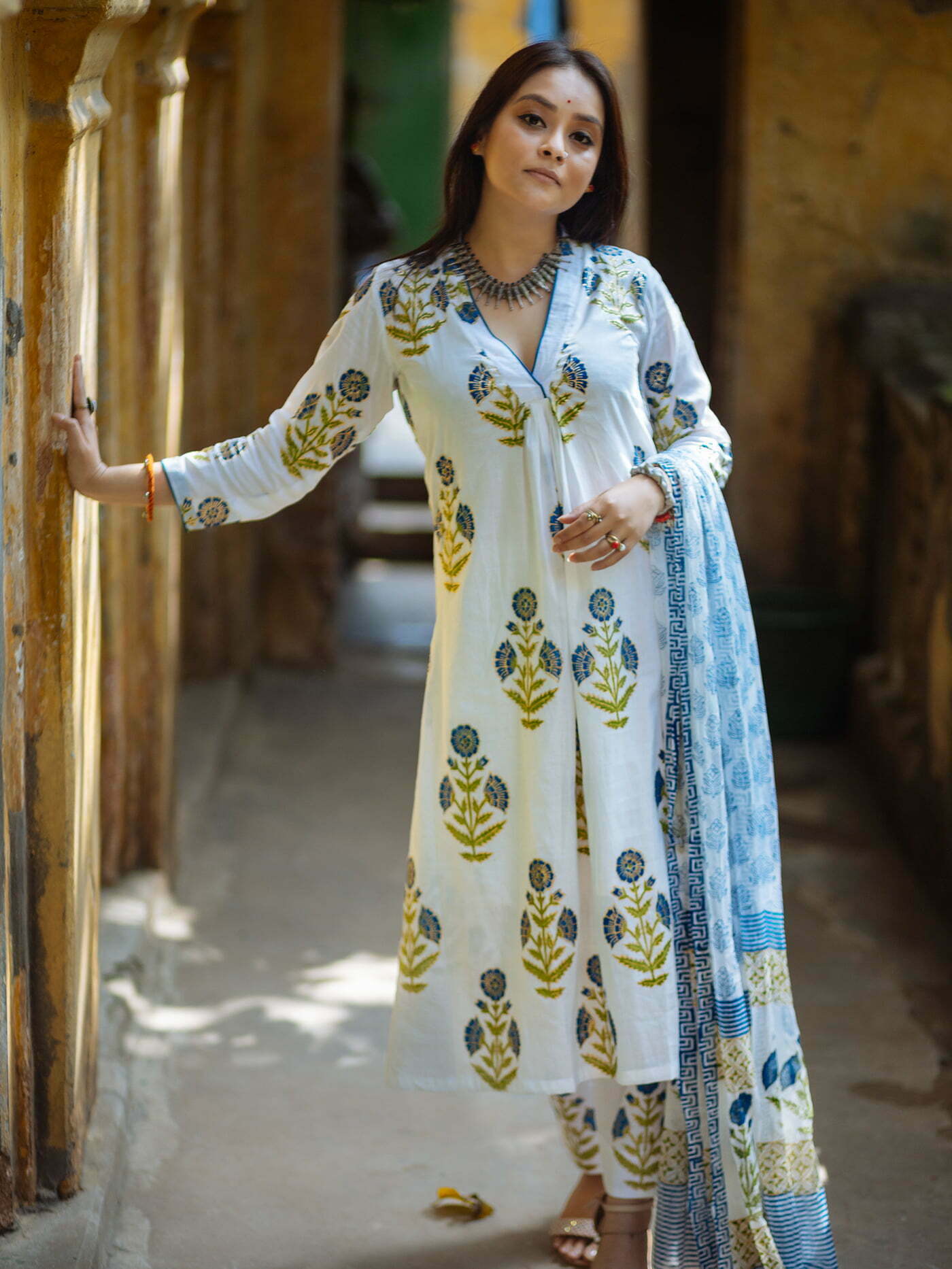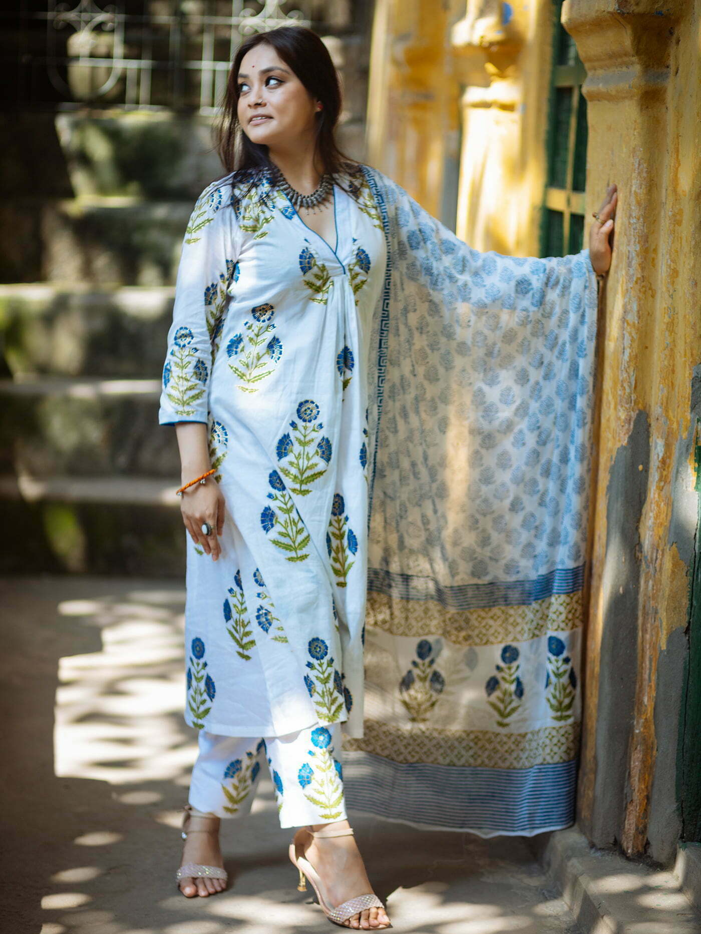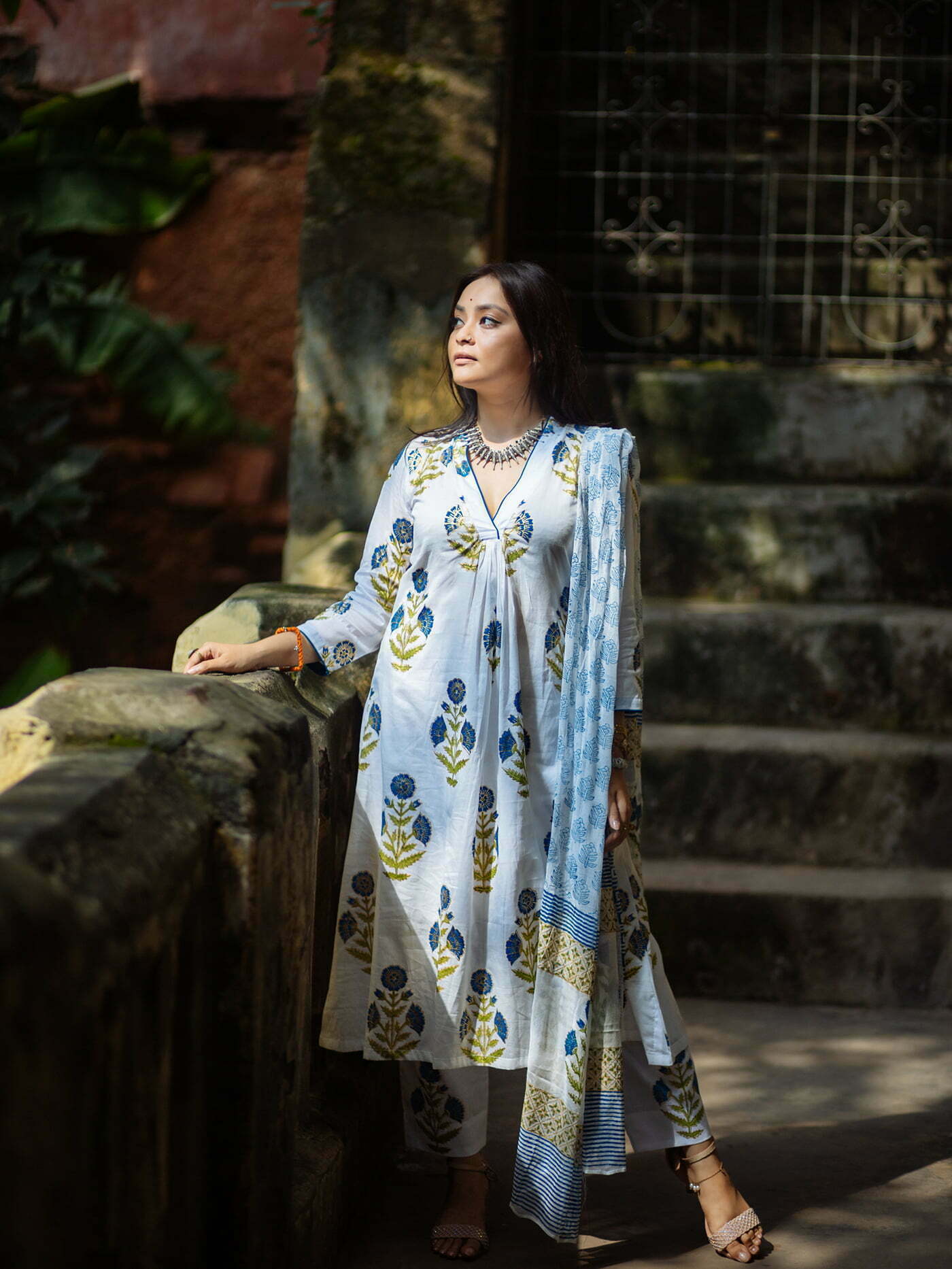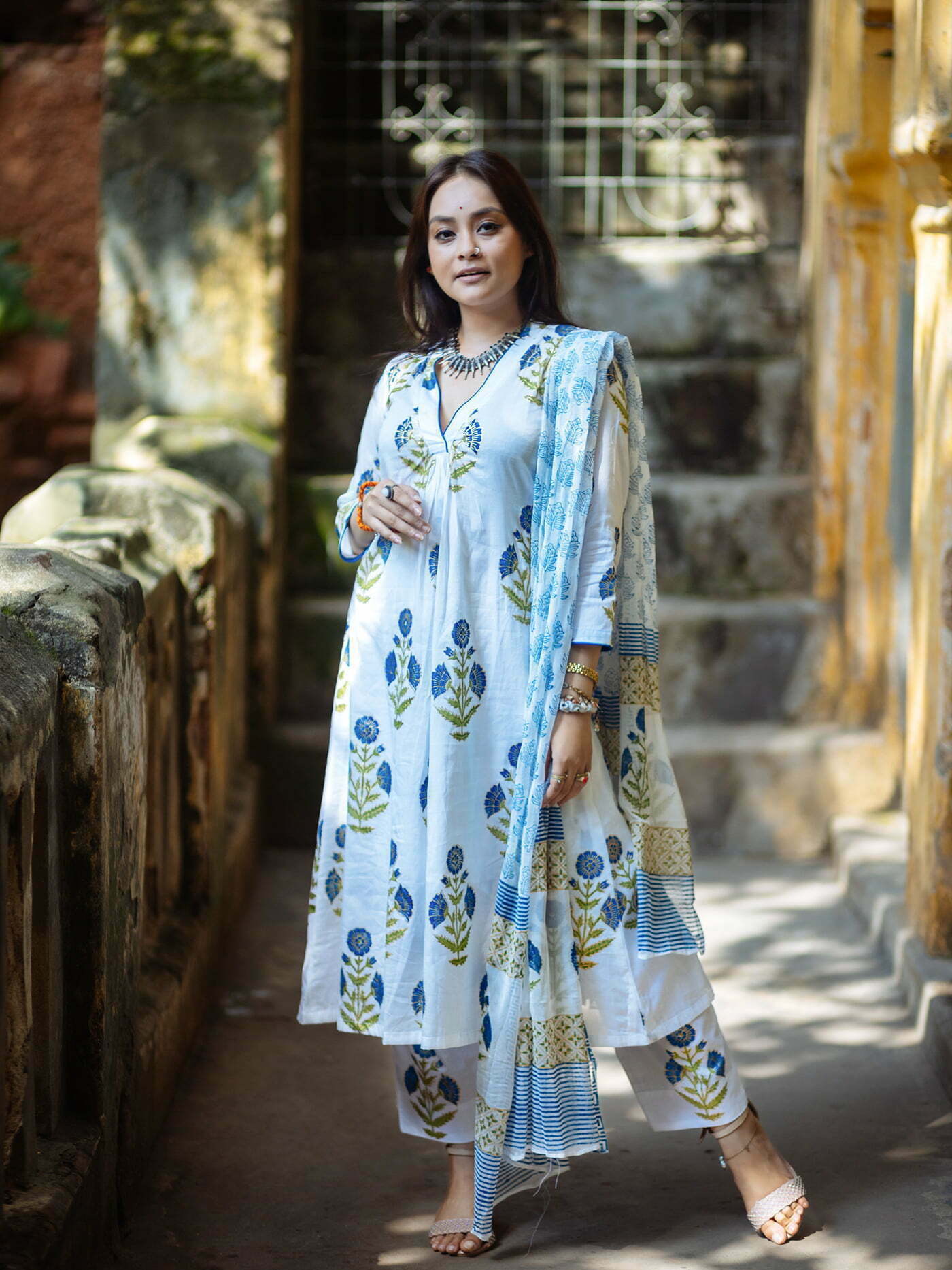 Featuring- straight cut agroduth Voile cotton block printed Kameez, pants and  dupatta.