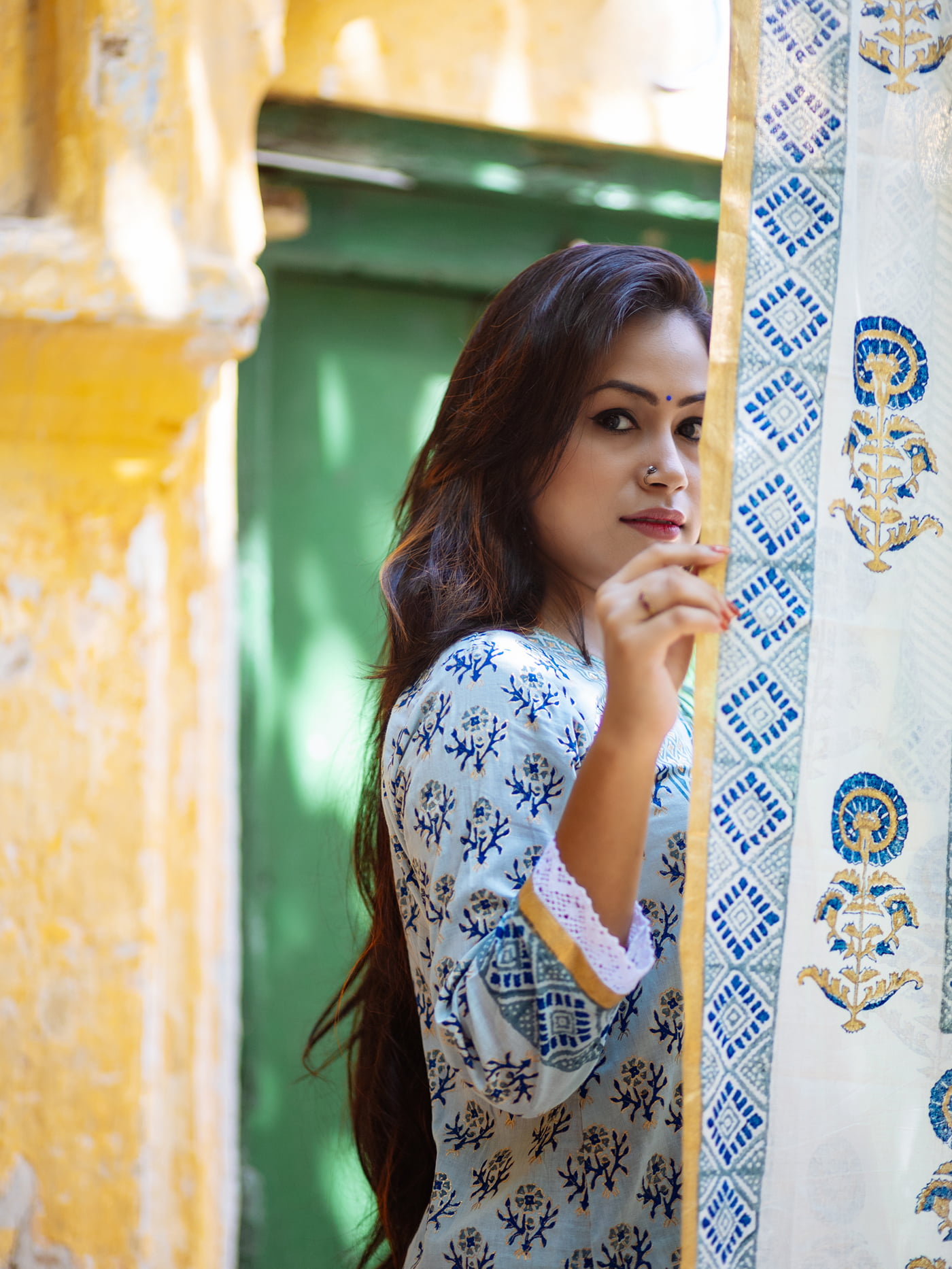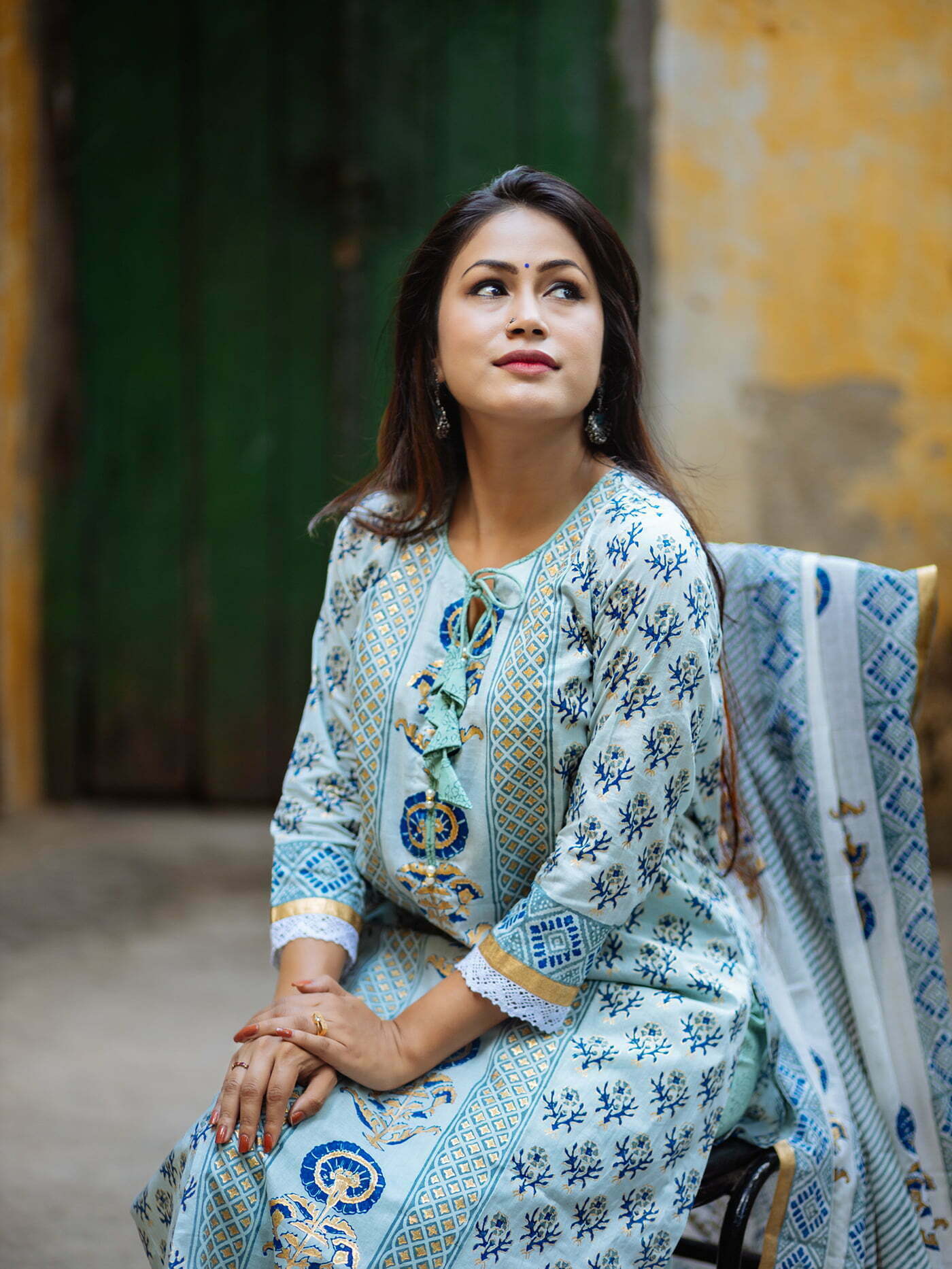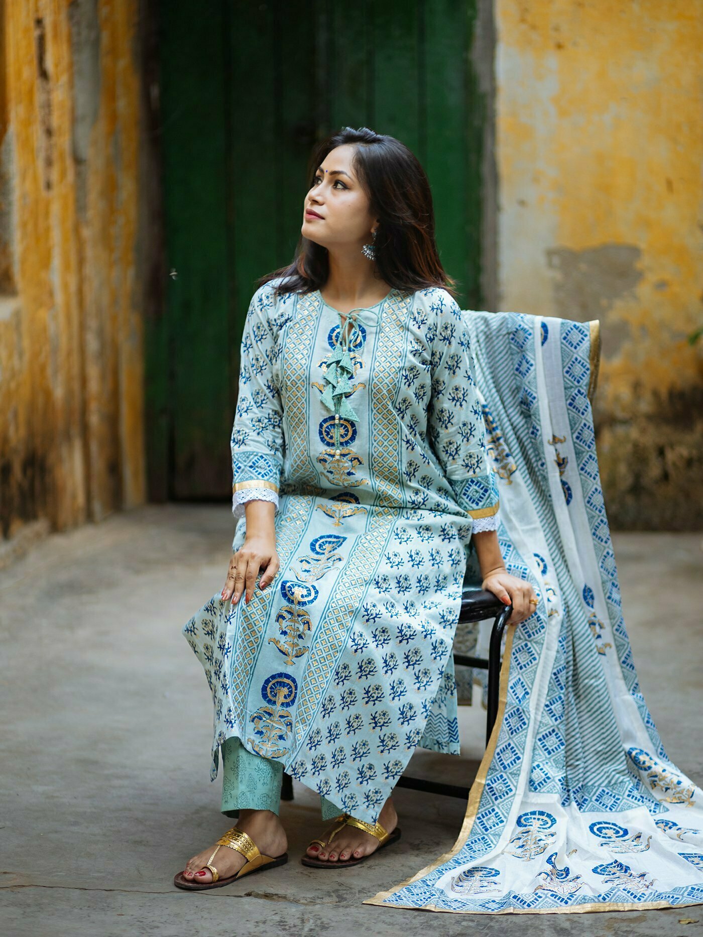 Featuring- straight cut agroduth Voile cotton block printed Kameez, pants and dupatta.