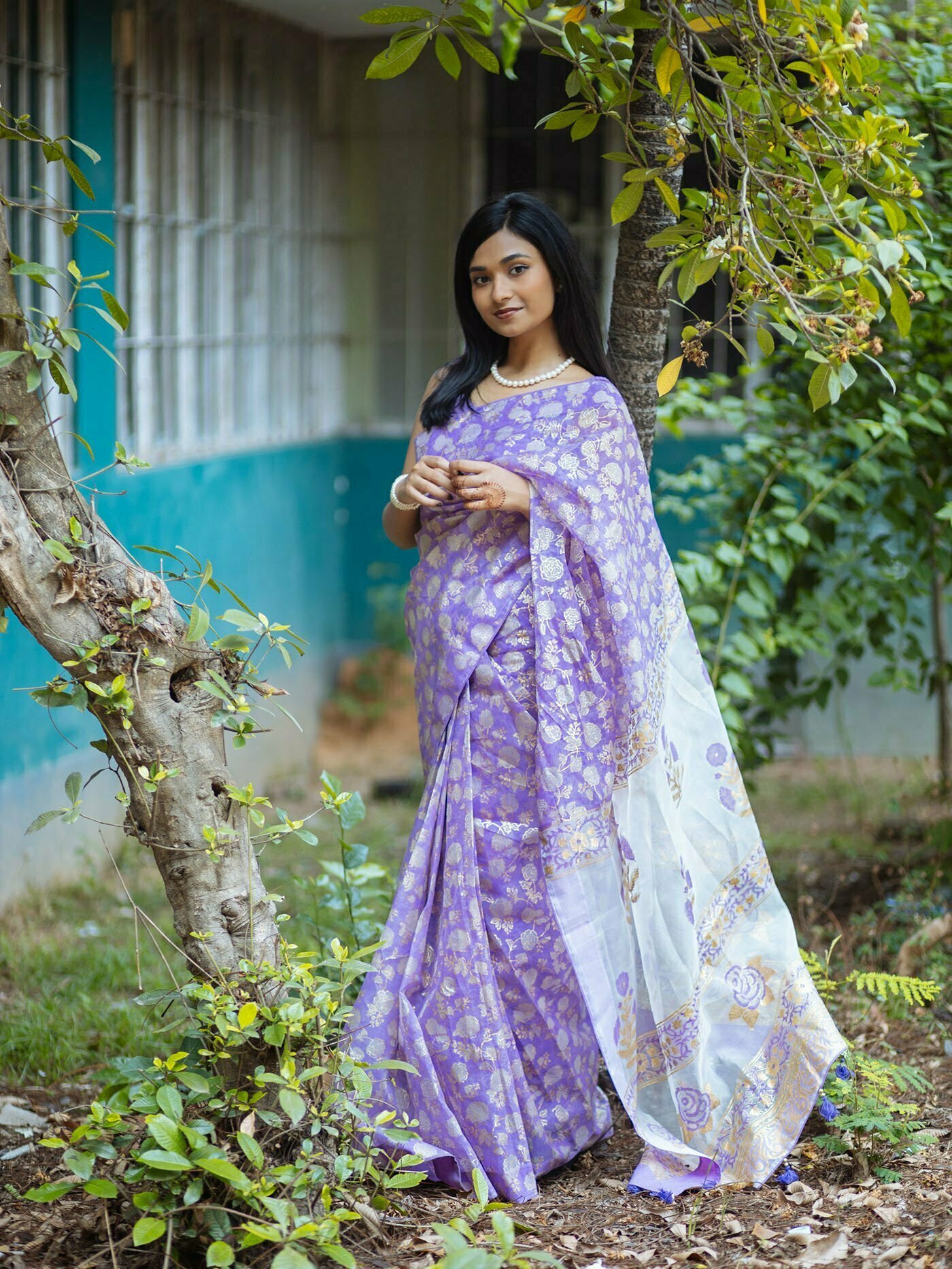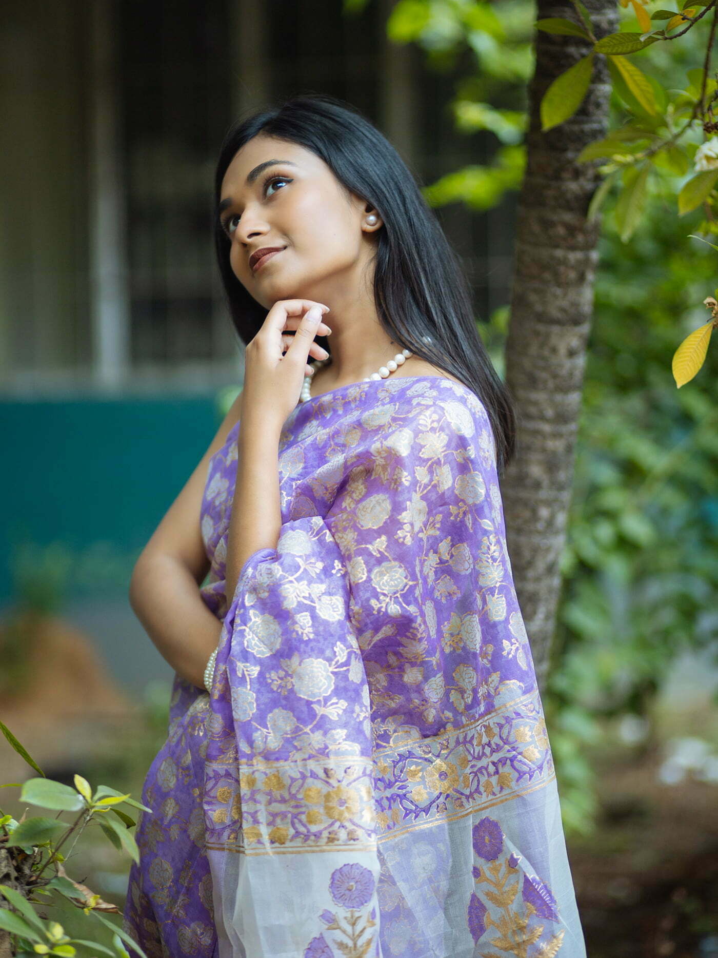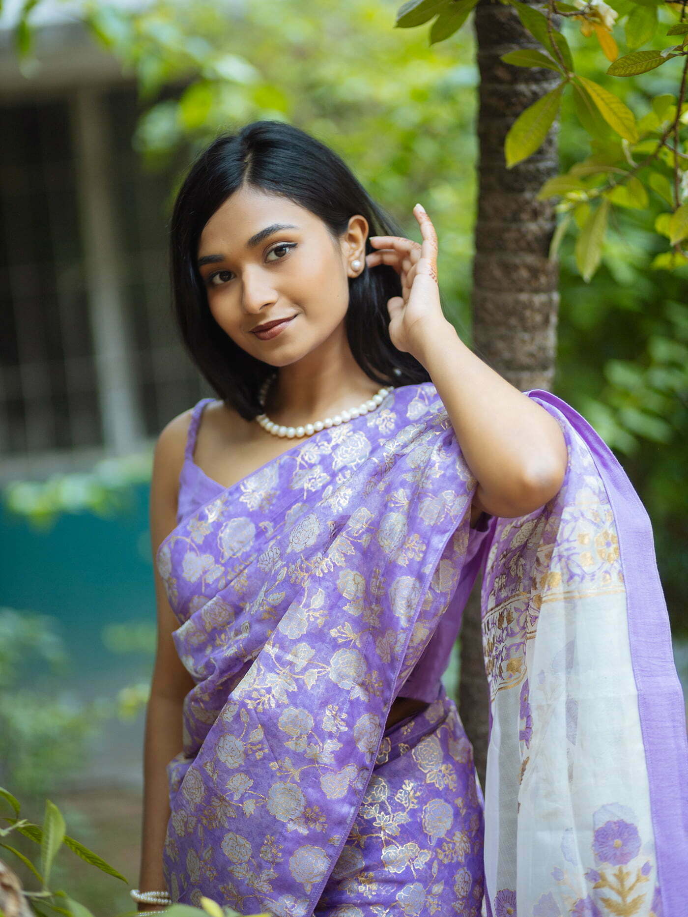 Moslin handbook printed dye s saree comes with handblock printed separate blouse piece.