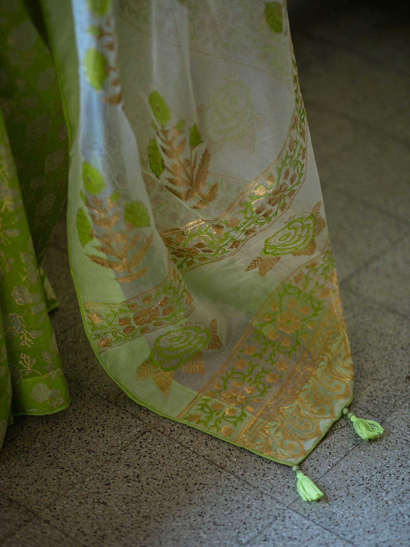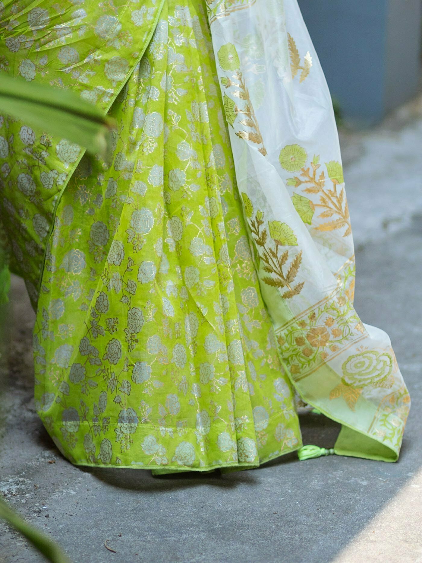 Moslin handbook printed dye s saree comes with handblock printed separate blouse piece.